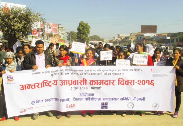 धनगढी । अन्तर्राष्ट्रिय आप्रवासी कामदार दिवस २०१६ अवसरमा आइतबार धनगढीमा सुरक्षित आप्रवासन (सामी) जिल्ला परियोजना समन्वय समिति, कैलालीके आयोजनामा प्रभातफेरी र्याली निकालिएको छ ।