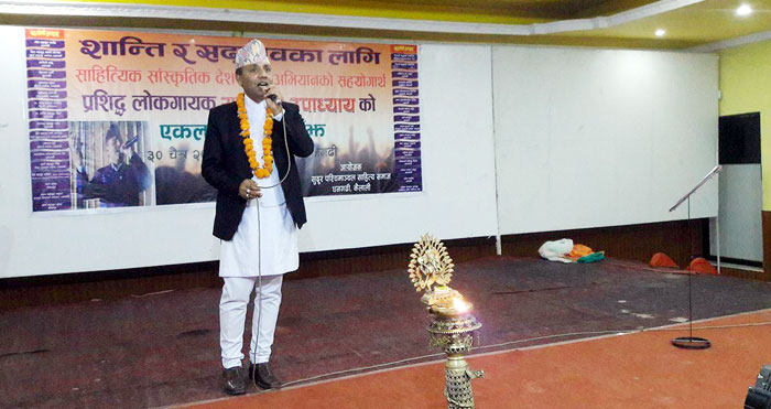 सुदूरपश्चिमाञ्चल साहित्य समाज, धनगढीद्वारा आयोजित ‘शान्ति र सद्भावका लागि साहित्यिक/सांस्कृतिक देशदर्शन अभियान’ को सहयोगार्थ डेउदा गायक समेत रहेका उपाध्यायको एकल सागीतिक साँझ भएको थियो ।