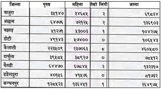 त्यस्तै, दार्चुलामा ३९ हजार पाँच सय ८५ पुरुष र ३८ हजार नौ सय २७ महिला गरी ७८ हजार पाँच सय १२, बझाङ्मा ५१ हजार दुई सय ७१ पुरुष, ५३ हजार तीन महिला र एकजना तेस्रोलिंगी गरी एक लाख चार हजार दुई सय ७५, अछाममा ६४ हजार सात सय ७६ पुरुष, ७२ हजार एक सय २५ महिला र दुई जना तेस्रोलिंगी गरि एक लाख ३६ हजार नौ सय तीन र बाजुरामा ३५ हजार एक सय ४७ पुरुष, ३४ हजार छ सय ८५ महिला र दुई जना तेस्रोलिङ्गी गरी ६९ हजार आठ सय ३४ मतदाता रहेका छन् ।