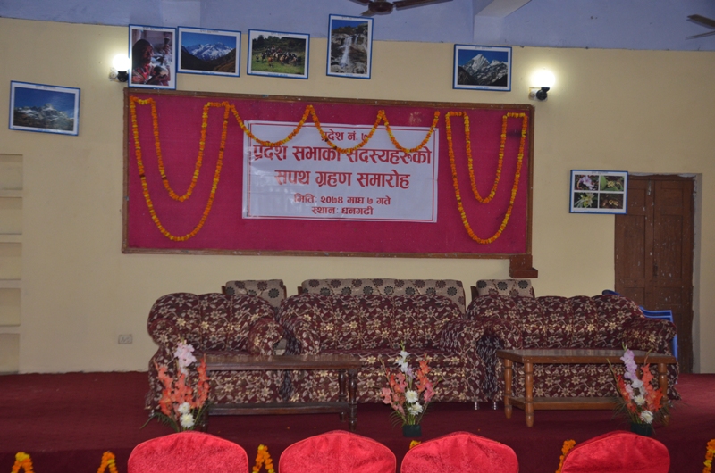 धनगढी । प्रदेश नम्बर ७ का प्रदेश सभा सदस्यहरूको सपथ ग्रहण कार्यक्रमको तयारी धनगढीमा पूरा भएको छ । सपथ ग्रहणका लागि जिल्ला समन्वय समिति कैलालीको सभा कक्षलाई प्रदेश सभा भवनका रूपमा व्यवस्थित गरिएको छ ।