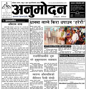 अनुमोदन दैनिक प्रकाशनको ११ औं वर्ष पुरा गरी १२ औं वर्ष प्रवेश गरेको यो अवसरमा हामीप्रति शुभेच्छा व्यक्त गर्नुहुने सम्पूर्ण पाठक वर्ग, विज्ञापनदाता, वितरक, समिक्षक तथा लेखक टिप्पणीकार र हाम्रा सम्पूर्ण पत्रकार साथीहरू तथा कर्मचारीहरूमा कृतज्ञता सहित शुभकामना व्यक्त गर्दछौं ।