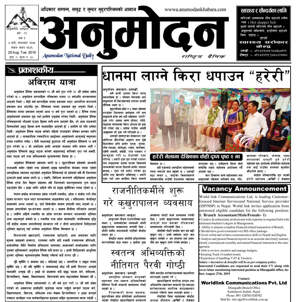 अनुमोदन दैनिकको प्रकाशन जारी छ । सुदूरपश्चिम प्रदेशको अस्थायी राजधानी समेत रहेको तथा प्रदेशको प्रमुख व्यापारिक केन्द्रका रुपमा रहेको धनगढीबाट प्रकाशन भइरहेको अनुमोदन दैनिकलाई यो प्रदेशको सबै नौ जिल्लामा पु¥याउने हाम्रो प्रयास जारी छ । यद्यपि, विभिन्न कारणले अहिलेसम्म अनुमोदन दैनिक हरेक दिन बिहान प्रदेशका सबै जिल्लाको सदरमुकाममा पुग्न सहज भइरहेको छैन । हाम्रा लागि अहिले पनि यो प्रमुख चुनौतिका रुपमा रहेको छ ।