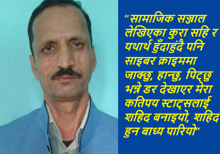 लेखिएका कुरा सहि र यथार्थ हुँदाहुंदै पनि साइबर क्राइममा जाक्छु, हान्छु, पिट्छु भन्ने डर देखाएर मेरा कतिपय स्टाट्सलाइ शहिद बनाइयो, शहिद हुन बाध्य पारियो ।खासमा मान्छे देखिए जस्तो ,सुनियो जस्तो, बुझिए जस्तो, बुझाइए जस्तो वीर हुन ,साहसी हुन नसकिदों रैछ । डराउनै पर्दोरैछ । कायर पनि हुनै पर्दोरैछ । समाजका, संस्कृतिका, व्यवहारिक जीवनका सीमा भित्र खुम्चिनै पर्दो रैछ, संकुचित हुनै पर्दोरैछ । सामाजिक सञ्जाल भन्दैमा लेख्न चाहेका सबै कुरा उन्मुक्त भएर लेख्न सकिन्नरैछ ।