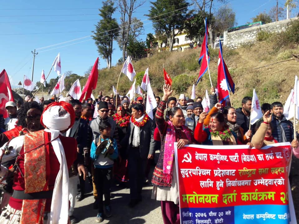 नेकपाबाट उम्मेदवारी दिएका तारामान स्वारको उम्मेदवारीमा कमल गडसेला प्रस्तावक तथा प्रदेश सभा सदस्य नन्दबहादुर सोडारी समर्थक रहेका छन् । यसैगरी नेकपाका अर्का उम्मेदवार शारदा भट्टको उम्मेदवारीमा प्रदेश सभा सदस्य पूर्णा जोशी प्रस्तावक तथा दिपायल सिलगढी नगरपालिका प्रमुख मञ्जु मलासी समर्थक रहेका छन् ।