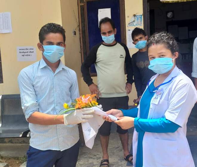 कोरोना मुक्त भएका २२ वर्षीय युवालाई फूल दिएर बधाई दिदै नर्स । तस्बिरः गोकर्ण दयाल