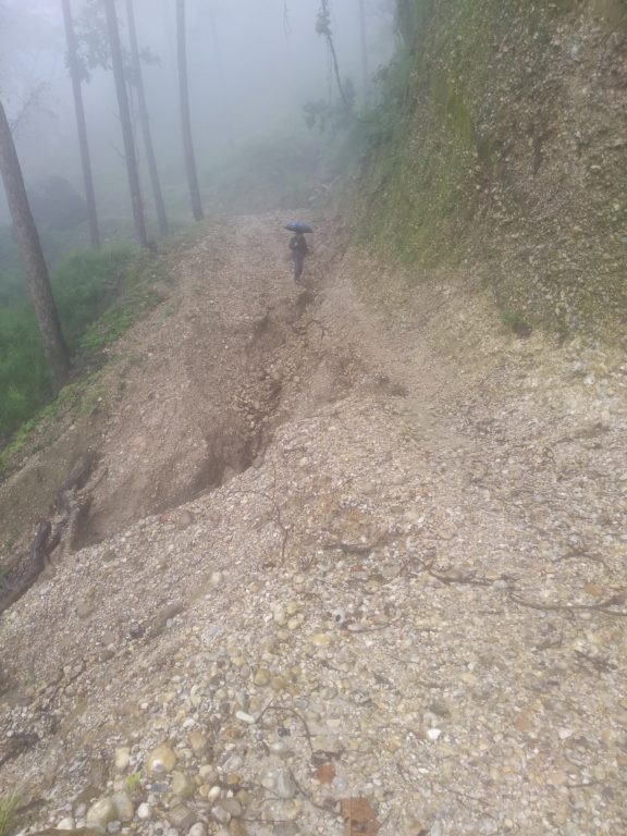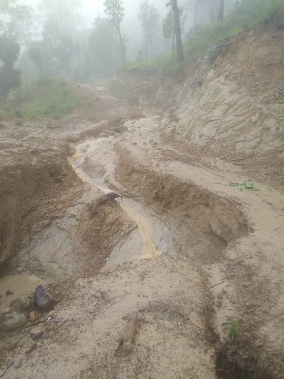 कमलो माटो । सडकको ठाउँ–ठाउँमा पहिरो गएको छ । खहरे खोला बग्ने ठाउँमा पानी निकासका लागि बनाइएको ‘ह्युमपाइप’ को माटो बगिसकेको छ । भाँसिएको माटोले ‘ह्यूमपाइप’ पनि टिक्न सक्ने अवस्था छैन । काटिएको सडकमा भर्खरै फुटेका मुलहरूका पानी बगिरहेका छन् ।