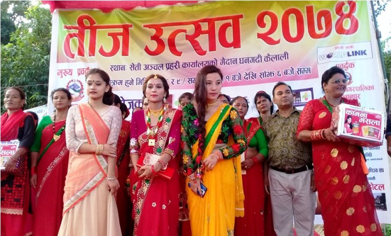धनगढी । हिन्दू धर्मावलम्बी महिलाहरूको महान धार्मिक पर्व हरितालिका तीज र गौरापर्वको अवसरमा धनगढीमा शनिबार महिला सम्मान तथा तथा तीज विशेष कार्यक्रम भएको छ ।