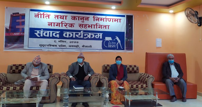 अनौपचारिक क्षेत्र सेवा केन्द्र (इन्सेक) सुदूरपश्चिम प्रदेश कार्यालयले सोमबार धनगढीमा आयोजना गरेको ‘प्रदेशका नीति तथा कानुन निर्माणमा नागरिक सहभागिता’ विषक संवाद कार्यक्रममा सहभागिहरूले सम्बन्धित संस्था तथा सरोकारवाला निकायको सहभागितामा नीति तथा कार्यक्रम बने कार्यान्वयन पनि प्रभावकारी हुने सुझाव दिए ।