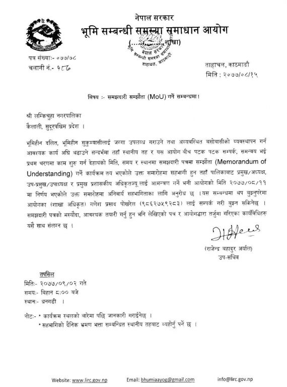 लम्की / कैलाली जिल्लाको लम्की चुँहा नगरपालिकाले अव आफैले भूमिहीन दलित, भूमिहीन सुकम्वासी तथा अवस्थित बसोबासलाई व्यवस्थित गर्न पाउने भएको छ ।