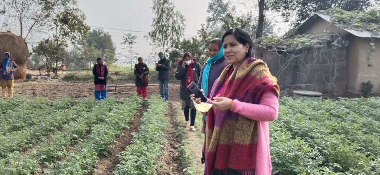 लहलहाउदो स्थानीय (थारु) जातको आलुखेती देखेर उपप्रमुख भट्टले किसान अनामिका चौधरीलाई सोधिन्– कुन महिना लगाएको हो । यो खेतीमा के–के मल हाल्छौं ? कति उत्पादन हुन्छ ?’