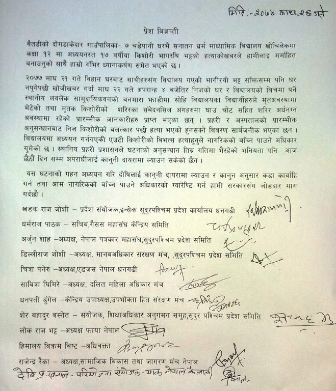 इन्सेक सुदूरपश्चिम कार्यालय, गैरसरकारी संस्था महासंघ, नेपाल पत्रकार महासंघ सुदूरपश्चिम प्रदेश समिति, मानव अधिकार संरक्षण मञ्च, एडजस नेपाल, दलित महिला अधिकार मञ्च, उपभोक्ता हित संरक्षण मञ्च, शिक्षा अधिकार अनुगमन समूह सुदूरपश्चिम, फाया नेपाल, सामाजिक विकास तथा जागरण मञ्च नेपाल याक नेपाल लगायतले संयुक्त प्रेस विज्ञप्ति जारी गरेर भागरथीलाई तत्कालै न्याय दिन माग गरेका छन् ।