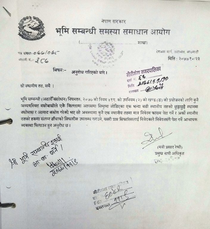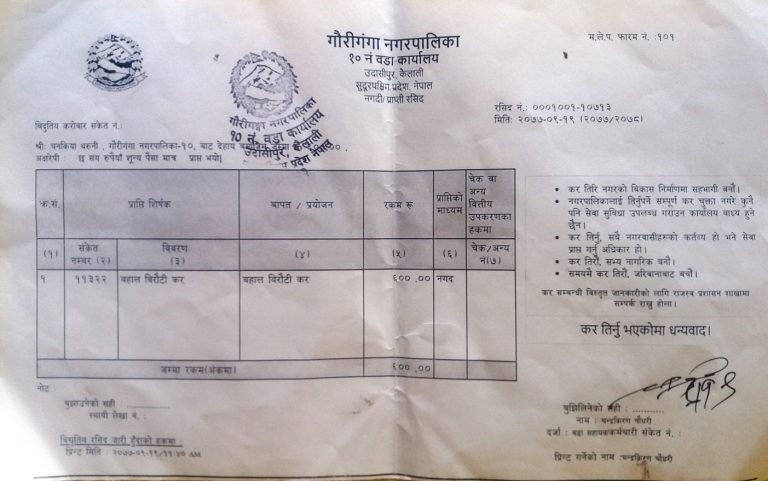उनी आफू बसोबास गरेको जग्गा प्राप्तीका लागि भूमि सम्बन्धी समस्या समाधान आयोगमा फाराम भर्न गइन् । तर, गौरिगंगा नगरपालिकाको वडा नम्बर १० कार्यालयले उनको फाराम भर्न इन्कार ग¥यो । उनले वडा कार्यालयका कर्मचारीहरुलाई आफूले तिर्दै आएको बहाल विरौटी करको रसिद देखाइन् । तर, पनि वडा कार्यालयले मानेन । उनकी बुहारी रविनाले अनुमोदन दैनिकलाई आफुले तिरेको करको रसीद देखाउँदै भनिन्– हामीबाट कर लिन हुने, तर फाराम किन नभर्ने ?