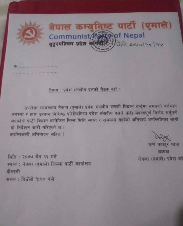 बैठक सोमबार (आज) दिउँसो १ बजे एमालेको जिल्ला पार्टी कार्यालयमा राखिएको थापाद्धारा हस्ताक्षरित पत्रमा उल्लेख छ ।