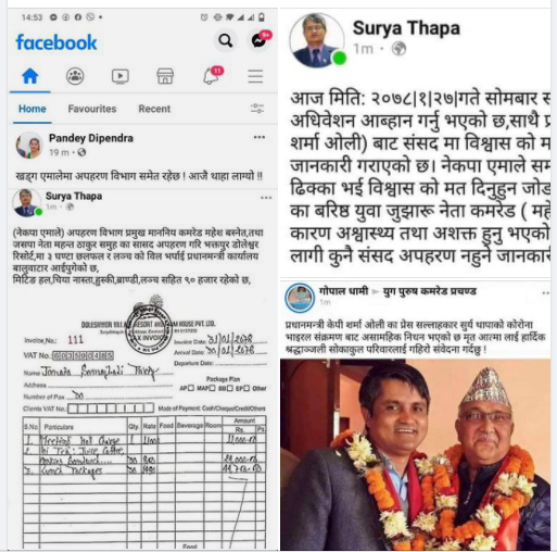 उनले भनेका छन् आइसोलेसनमा रहेका बेला कतिपय यस्ता निकृष्ट र अपराधिक कार्यहरू गरेको पाएर आश्चर्यचकित भएको छु । ‘युगपुरूष प्रचण्ड’ नामक ग्रुपबाट नै म जिउँदो मान्छेलाई दुष्ट नियतका साथ ‘श्रद्धाञ्जलि’ नै दिइएको देख्दा अपराधीहरूको कुकृत्य झनै छर्लङ्ग भएको छ, प्रेस सल्लाहकार थापाले फेसबूकको आफ्नो स्टाटसमा लेखेका छन् ।