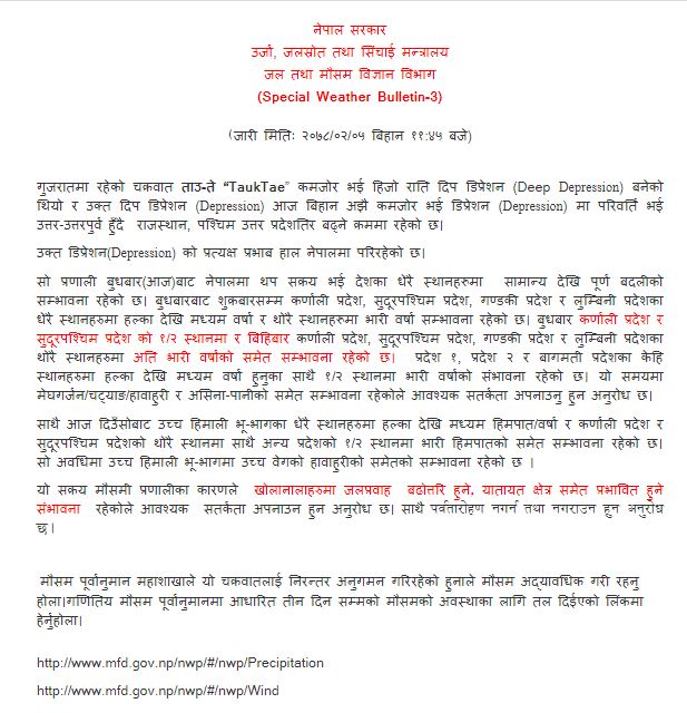 विभागले विशेष मौसमी बुलेटिन निकालेर भारतमा आएको ‘ताउ–ते’ चक्रवातका कारण आज सुदूरपश्तिम र कर्णाली प्रदेश तथा भोलि कर्णाली, सुदुरपश्चिम, गण्डकी र लुम्बिनी प्रदेशका केही ठाउँमा ठूलो पानी पर्ने सम्भावना रहेको भन्दै सचेत रहन आग्रह गरेको हो ।