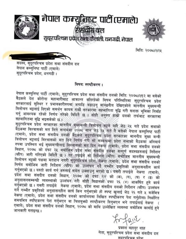 उनले नेकपा माओवादी केन्द्रका नेता तथा सुदूरपश्चिम प्रदेशका मुख्यममन्त्री त्रिलोचन भट्टलाई मतदान नगर्ने पूर्वमन्त्री पठानसिंह बोहरा, रतन थापा, नेपालू चौधरी, लिलाधर भट्ट, ग्याल्वुसिंह बोहरा, बलदेव रेग्मी, र माया तामाङ बोहरालाई स्पष्टीकरण सोधेका हुन ।