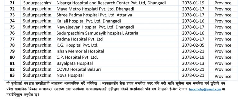 मन्त्रालयको बुधबारसम्मको तथ्यांक अनुसार सुदूरपश्चिम प्रदेशका १३ सहित देशभरका ८३ वटा अस्पतालमा कोरोना संक्रमितको नि:शुल्क उपचार हुने छ।
