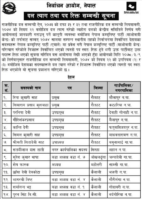 निर्वाचन आयोगले आज एक सूचनामार्फत उनीहरूको पद रिक्त भएको जानकारी गराएको हो । माओवादी केन्द्रको अनुरोधको आधारमा उनीहरूको पद रिक्त भएको आयोगले जनाएको छ । पद रिक्त हुनेमा २ जना मेयर, ५ जना उपमेयर, केही गाउँपालिका अध्यक्षसहित विभिन्न जिल्लाका वडाध्यक्ष र सदस्य छन् । उनीहरू अधिकांश रौतहट र कैलालीका हुन् ।