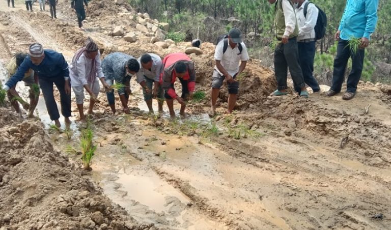 धनगढी । धान दिवसका दिन कैलालीको चुरेको सडकमा रोपाइँ गरिएको छ।