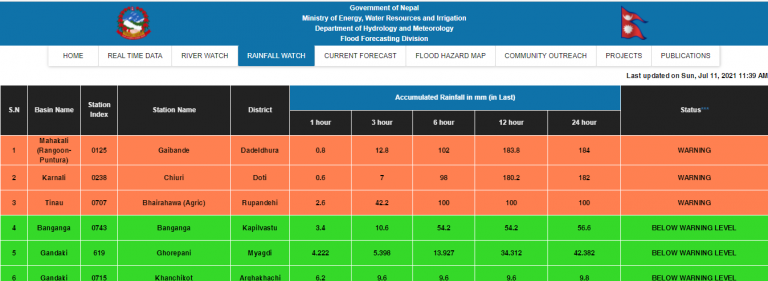 डडेल्धुराको गाइबण्डे र डोटीको चिउरी स्टेशनको वर्षा मापन अनुसार चेतावनी तहभन्दा बढी वर्षा भइरहेको उल्लेख छ ।