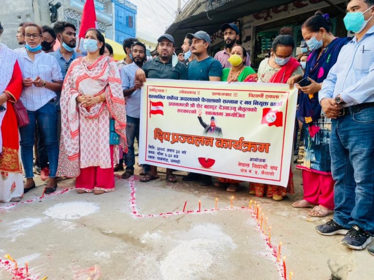 धनगढी स्थित पार्कमोडमा नेपालको नक्सामा दिप प्रज्वलन गरेर नेविसंघले नवनियुक्त प्रधानमन्त्री शेर बहादुर देउवा र सर्बोच्च अदालतको फैसलाको स्वागत गरेको हो । दिप प्रज्वलन गर्दै नेविसंघले नेपाली कांग्रेस जिन्दावाद, नेपालको संविधान जिन्दावाद, सर्बोच्च अदालत जिन्दावाद, शेरबाहुर देउवा जिन्दावाद जस्ता नारा लगाएका थिए ।