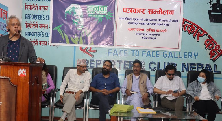 रिपोर्टर्स क्लब नेपालमा शुक्रबार पत्रकार सम्मेलन आयोजना गरी अभियन्ताहरुले गाँजा अभियन्ता राजीव काफ्लेलाई गृह मन्त्रालयको ठाडो आदेशमा प्रहरीले १५ दिनसम्म थुना राखेको भन्दै विरोध गरे ।