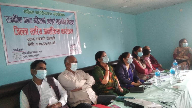 धनगढी / दलित महिला अधिकार मञ्च नेपाल कैलालीको आयोजनामा आइतबार धनगढीमा राजनीतिक दलमा महिलाको अर्थपूर्ण सहभागिता विषयक जिल्लास्तरीय अन्तरक्रिया कार्यक्रम भएको छ ।