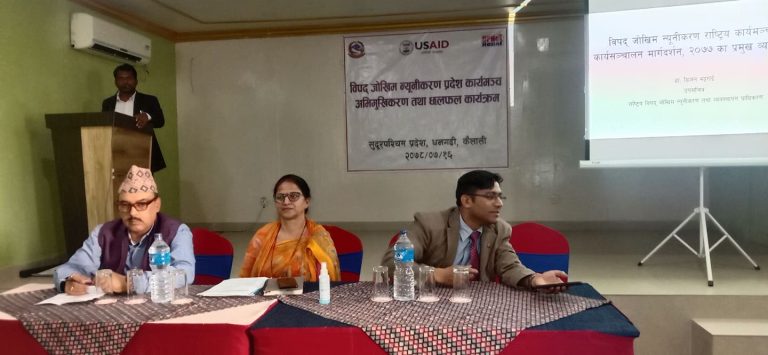 धनगढी । विपदको जोखिममा रहेको सुदूरपश्चिम प्रदेशका सरोकारवालाहरूले प्रदेश सरकारलाई विपद जोखिम न्यूनीकरण प्रदेश कार्यमञ्च गठन गराउन सुझाव दिएका छन् ।
