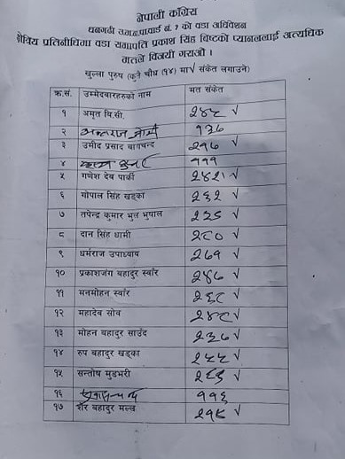 सो वडामा प्रकाशसिंह विष्ट ३२ सदस्यीय वडा समिति सहित सभापति पदमा निर्विरोध निर्वाचित भएका थिए । यस्तै गरेर महिला, दलित, खस आर्य लगायतका आरक्षित सिटमा पनि क्षेत्रीय प्रतिनिधि सर्वसम्मत भएका थिए ।
