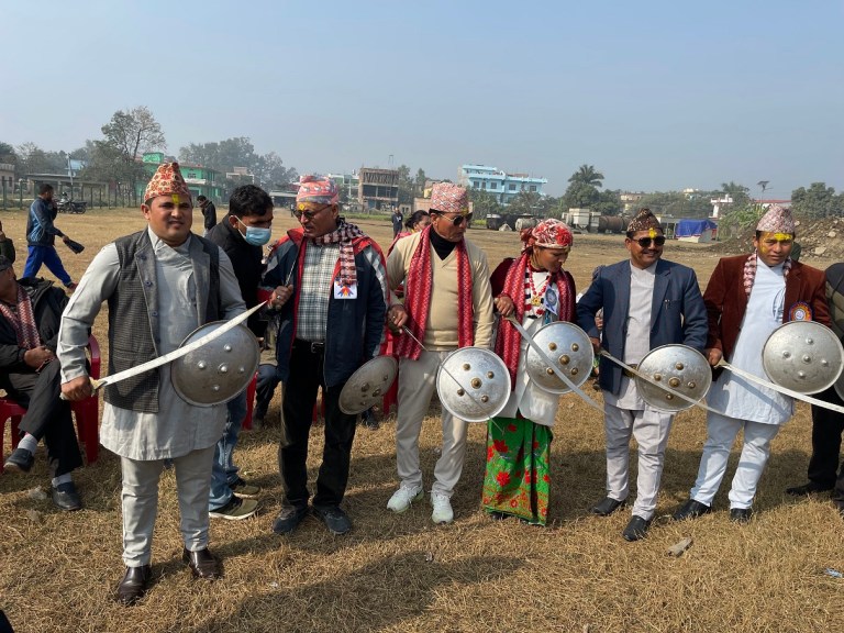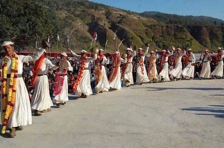 धनगढी / ढोलक, दमाहा, झ्यालीको लयवद्ध तालमा सेतो आकर्षक पहिरनमा सजिएका पुरुषहरू तरवार र ढालको कलात्मक हस्तमुद्रासहित एकनासको पदचालमा विभिन्न हाउभाउ सहित गोलाकारमा नृत्य गरिरहेका छन् । बीच भागमा रहेका वाद्यवादकहरूले दमाहा, झ्याली, ट्याम्कोमा बडो जोशका साथ ताल दिइरहेका छन् ।