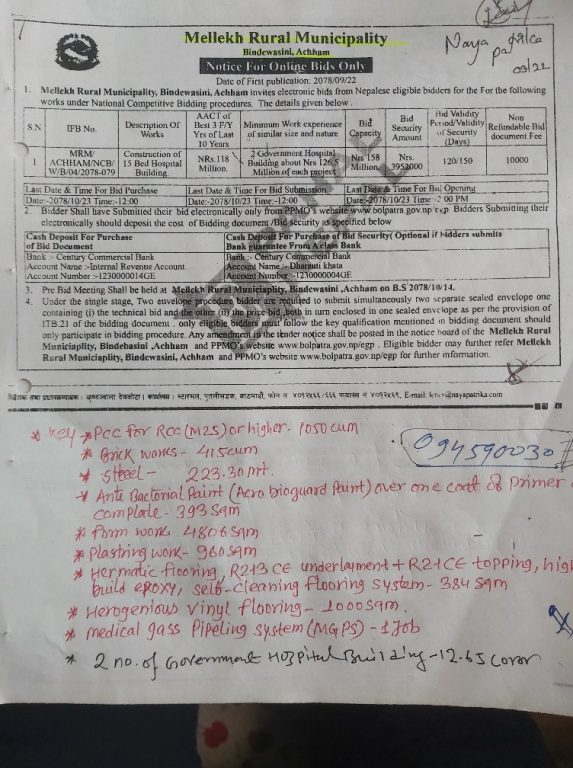 धनगढी / अछामका दुई गाउँपालिकाले अस्पताल निर्माणको काम मिलोमतोमा काम गराउनका लागि अनावश्यक शर्त राखेको पाइएको छ ।