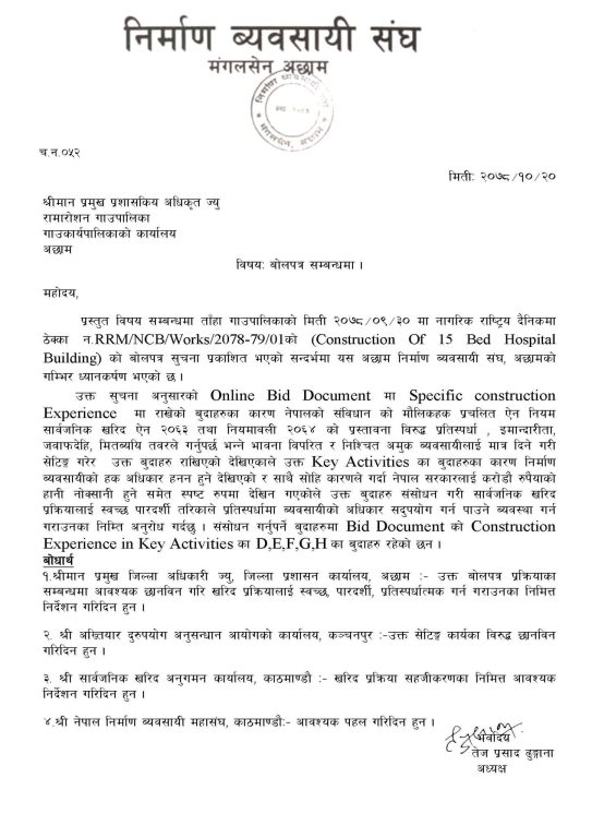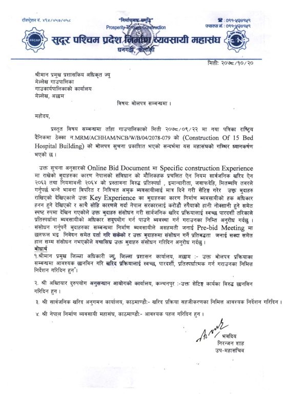 सुदूरपश्चिम प्रदेश निर्माण व्यवसायी संघ र अछाम निर्माण व्यवसायी संघले दुईवटै पालिकालाई अनावश्यक शर्त हटाउन आग्रह गरेका थिए ।