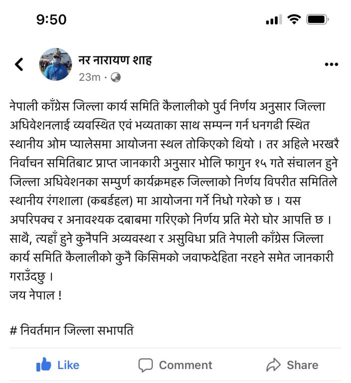 काँग्रेसको अघिल्लो जिल्ला अधिवेशनबाट निर्वाचित सभापति र प्रदेश महामन्त्री नरनारायण शाहले मतदान स्थल सारिएको जानकारी दिएको छन् । उनले लेखेको फेसवूक स्टाटस अनुसार निर्वाचन समितिले दवावमा मतदान स्थल सारेको हो ।