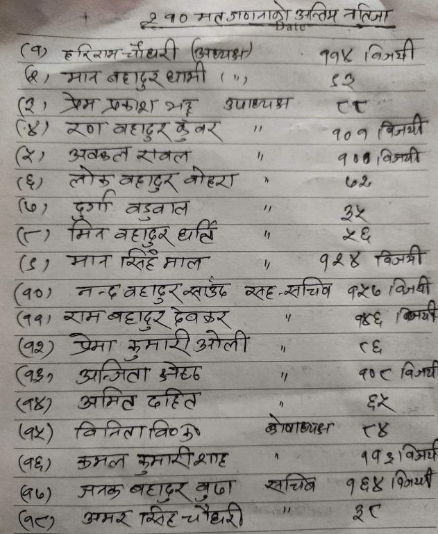 चौधरीसित सुदूरपश्चिम सरकारका पर्यटन मन्त्रीसमेत रहेका मानबहादुर धामी (सन्तोष) पराजित भएका हुन । २१० मतमध्ये चौधरी ११४ मत पाउदै विजयी भएका हुन् भने धामीले ९३ मत पाए।