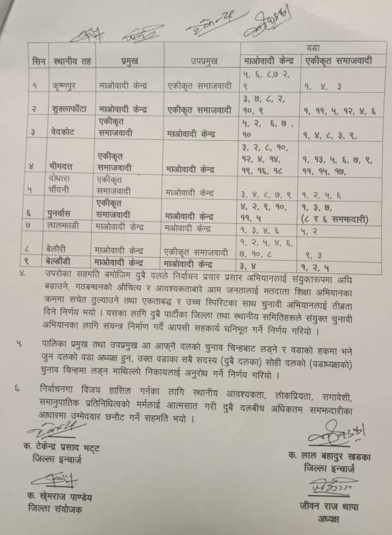 माओवादीले भीमदत्त, दोधारचाँदनी, वेदकोट, पुर्नवास नगरपालिका, लालझाडी र वेलडाँडी गाउँपालिकाको उपप्रमुखमा उम्मेदवारी दिने भएको सहमति पत्रमा उल्लेख छ ।