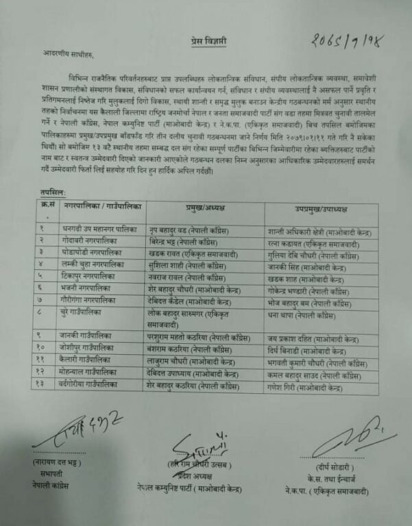 गठवन्धनबाट कैलालीका १३ वटैपालिकामा यी भए आधिकारिक उम्मेदवार -अनुमोदन खबर संवाददाता धनगढी / Publsih On : Wednesday April 27, 2022
