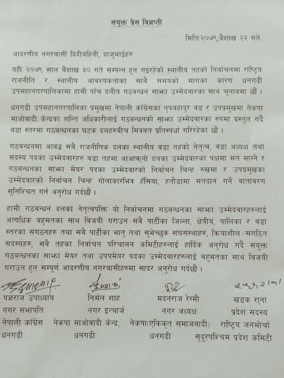 नेपाली काग्रेंसको तर्फबाट नगर सभापति यज्ञराज उपाध्याय, नेकपा माओवादी केन्द्रको तर्फबाट नगर ईन्चार्ज निर्मल शाह, नेकपा समाजवादीको तर्फबाट नगर अध्यक्ष मदनराज रेग्मी र राष्ट्रिय जनमोर्चाको तर्फबाट प्रदेश सदस्य खडक रानाले संयुक्त रुपमा विज्ञप्ती जारी गर्दै गठबन्धनका साझा उम्मेदवारलाई जिताउन आग्रह गरेको हो ।