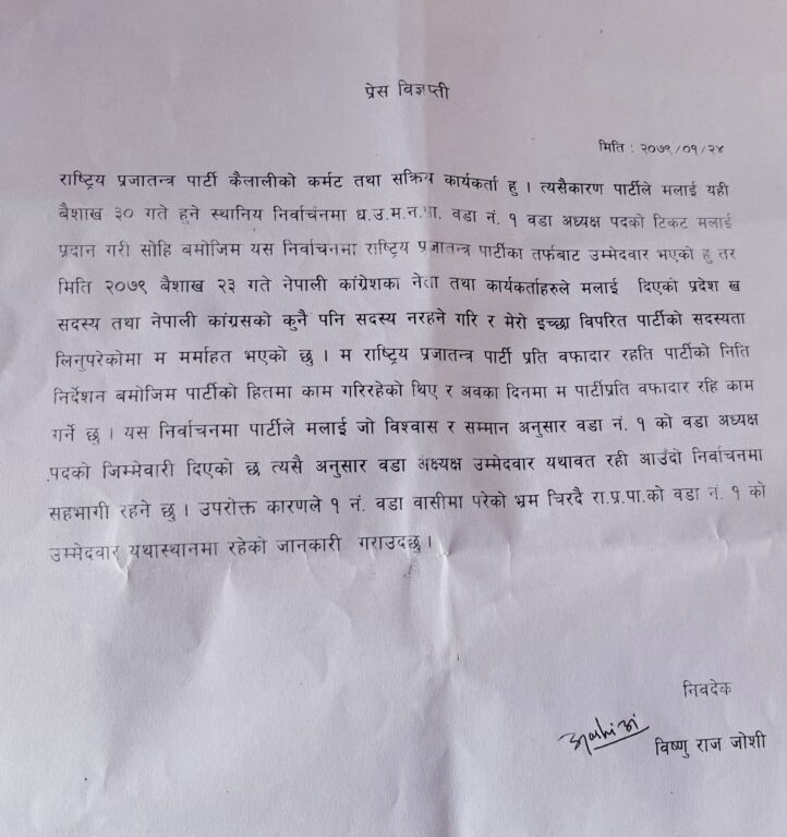 उनले एक प्रेस विज्ञप्ती जारी गर्दे आफू राप्रपाको इमान्दार कार्यकर्ता हु तर मेरो इच्छा विपरित काँग्रेसको सदस्यता दिइएको बताएका छन् ।
