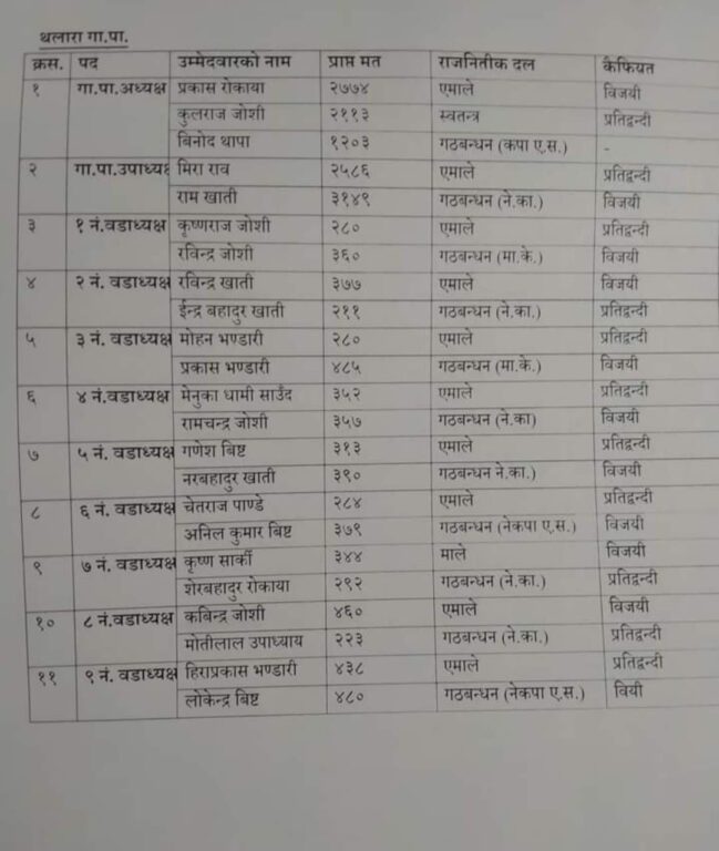 वझाङकाको थलारामा एमालेका रोकाया विजयी ( मत परिणाम सहित)