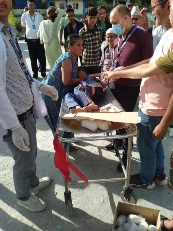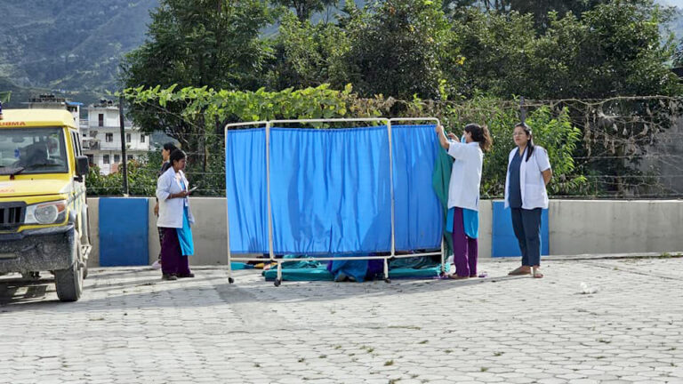 बझाङ अस्पतालका स्वास्थ्यकर्मी खुला ठाउँमा प्रसुती सेवा दिदै