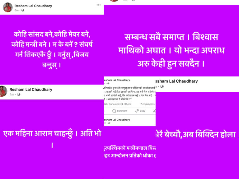उनले सुदूरपश्चिम र लुम्बिनि सरकार छोड्नु पर्ने बताइरहेका बेला अध्यक्ष रञ्जिता श्रेष्ठ निकट टिका थापा सुदूरपश्चिमको मन्त्री भएपछि त्यस्तो टिप्पणी लेखेको बताइएको छ ।