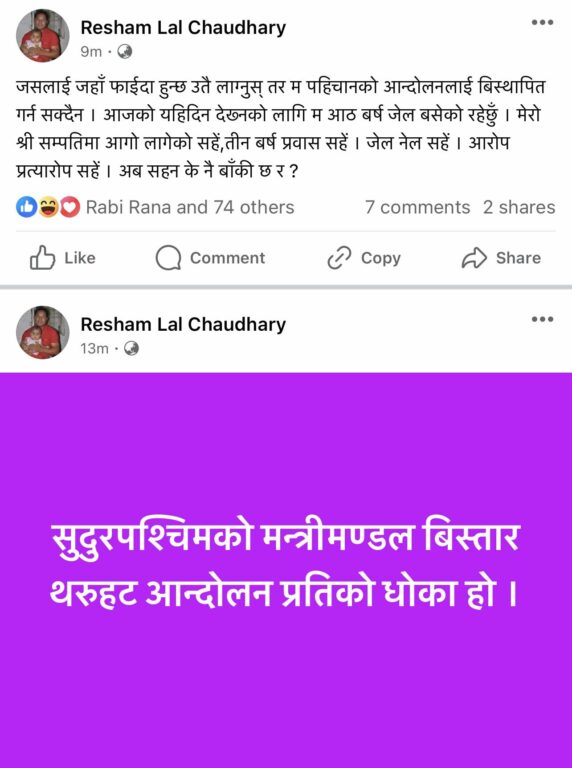 उनले सुदूरपश्चिम प्रदेश सरकार विस्तार बारे टिप्पणी गर्दे सुदूरपश्चिमको मन्त्रीमण्डल विस्तार थरुहट आन्दोलनप्रतिको धोका हो भन्ने टिप्पणी गरेका थिए ।