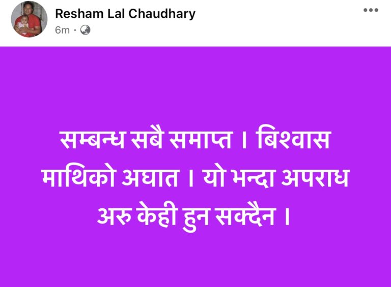 धनगढी/ नागरिक उन्मुक्ति पार्टीका संरक्षकले मंगलबार राति ९ : १७ मा फेसबुकमा स्टाटस लेख्दै सबै सम्वन्ध समाप्त । विश्वासमाथिको आघात । यो भन्दा अपराध केही हुन सक्दैन भनेका छन् ।