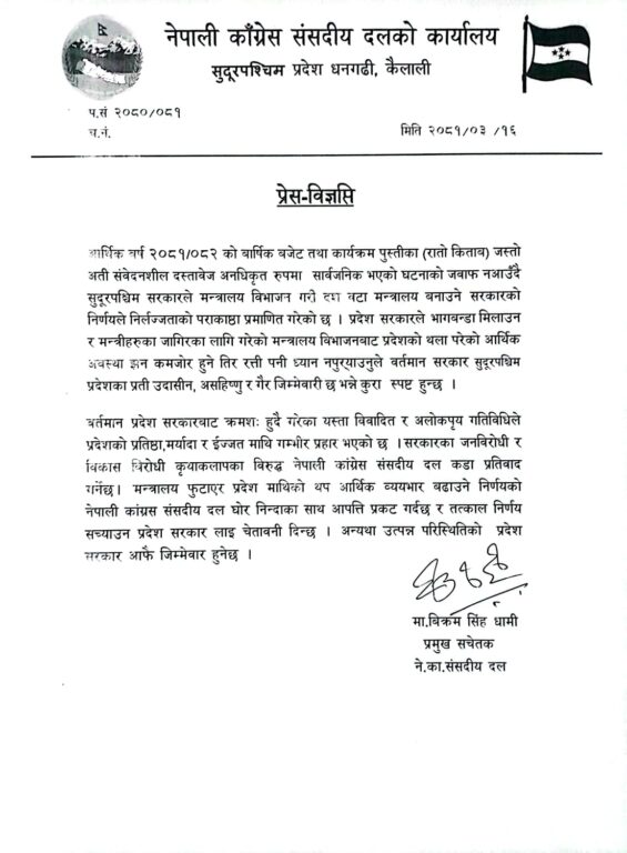 ‘मन्त्रालय फुटाएर प्रदेश माथिको थप आर्थिक व्ययभार बढाउने निर्णयको नेपाली कांग्रस संसदीय दल घोर निन्दाका साथ आपत्ति प्रकट गर्दछ र तत्काल निर्णय सच्याउन प्रदेश सरकारलाई चेतावनी दिन्छ’, प्रमुख सचेतक विक्रम धामीले जारी गरेको विज्ञप्तिमा भनिएको छ ।