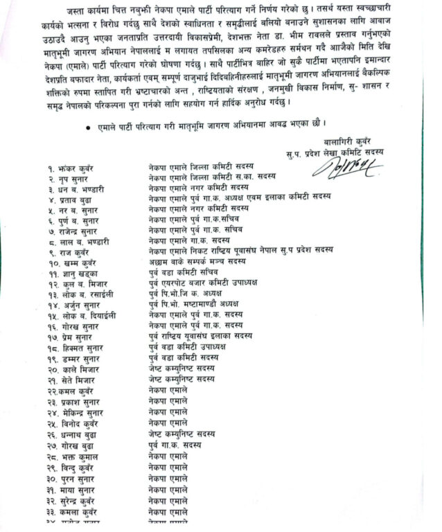 एमाले सुदूरपश्चिम प्रदेशको लेखा कमिटी सदस्य बालगिरी कुँवरको नेतृत्वमा ७६ जनाले सामूहिक रूपमा एमाले, समाजवादी र विभिन्न पार्टी परित्याग गरेका छन । उनीहरूले डा. रावलले सञ्चालन गरेको मातृभूमि जागरण अभियानमा समाहित हुने घोषणा पनि गरेका छन ।