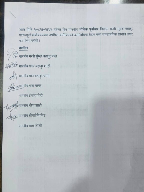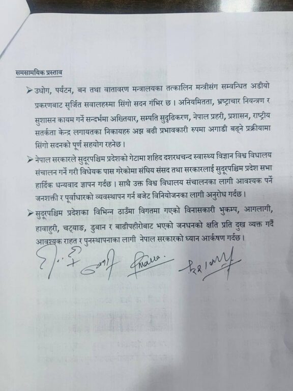 प्रदेश सभामा प्रस्तुत गरेर पास गर्ने उल्लेखित प्रस्तावको सहमतिमा भौतिक पूर्वाधारमन्त्री सुरेन्द्रबहादुर पाल, नेपाली कांग्रेसका पदमबहादुर शाही , एमालेका चक्र मल्ल, प्रतिपक्षी दलहरु माओवादीका मानबहादुर धामी, नेकपा ( एकीकृत समाजवादी) का नरेशबहादुर शाही र राप्रपाका खेमादेवी विष्टले हस्ताक्षर गरेका छन् ।