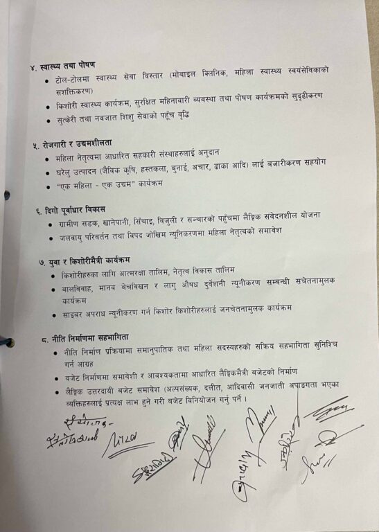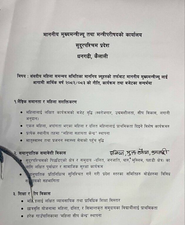 ज्ञापनपत्रमा सुदूरपश्चिम प्रदेशको आगामी आर्थिक वर्षको बजेटमा लैङ्गिक समानता र महिला सशक्तिकरणलाई प्राथमिकता दिनुपर्ने माग उठाइएको छ ।