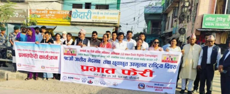 जिल्ला प्रशासन कार्यालय कैलालीको आयोजना र दलित अधिकारको क्षेत्रमा क्रियाशिल राष्ट्रिय दलित नेटवर्क, नेपाल, दलित महिला संघ, नेपाल राष्ट्रिय दलित समाज कल्याण संघ, दलित गैरसरकारी संस्था महासंघ, मानव अधिकार संरक्षण मञ्चसंगको समन्वयमा जातीय भेदभाव र छुवाछूतको अन्त्य गरौ, सामाजिक न्याय सहितको मानव मर्यादा कायम गरौ भन्ने मुल नाराका साथ १९ औ जातीय भेदभाव तथा छुवाछूत उन्मुलन राष्ट्रिय दिवसको अवसरमा धनगढीको चौराहाबाट प्रभातफेरी शुरु भई पार्कमोडमा कोणसभामा परिणत भएको थियो ।