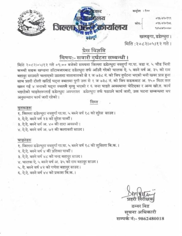 डडेल्धुरा / डडेल्धुराको नवदुर्गा गाउँपालिका–५ स्थित चौडमा जिप दुर्घटना हुँदा एउटै वडाका चार जनाको ज्यान गएको छ भने छ जना घाइते भएका छन्। जिल्ला प्रहरी कार्यालय डडेल्धुराले घटनाको पुष्टि गर्दै मृतक र घाइतेहरूको सनाखत गरेको छ।
