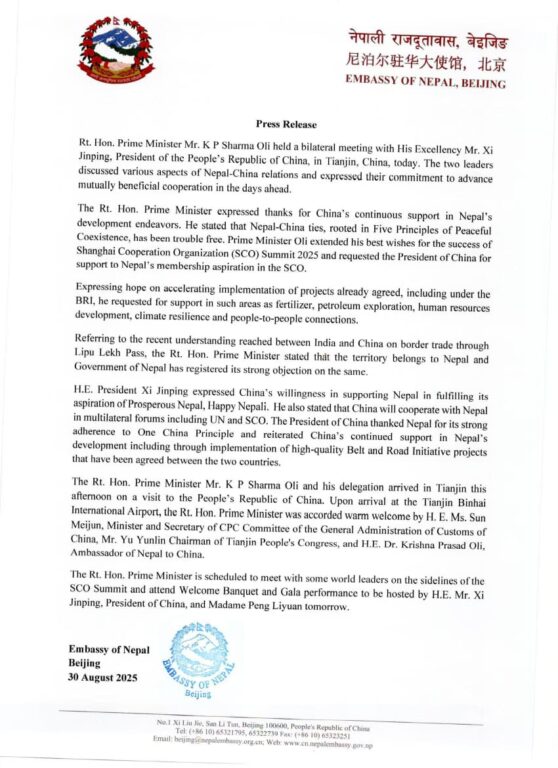 काठमाडौ/ प्रधानमन्त्री केपी शर्मा ओलीले चीनका राष्ट्रपति सी चिनफिङसँग तिञ्जिनमा द्विपक्षीय भेटवार्ता गरेका छन्। भेटमा दुई नेताले नेपाल–चीन सम्बन्धलाई अझ प्रगाढ बनाउने प्रतिबद्धता जनाएका छन्।